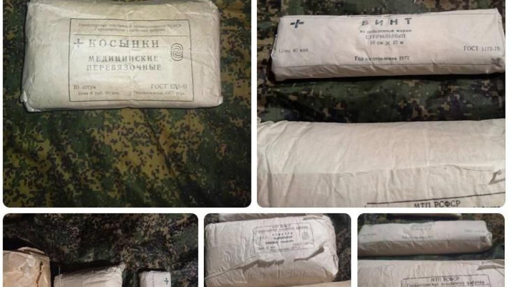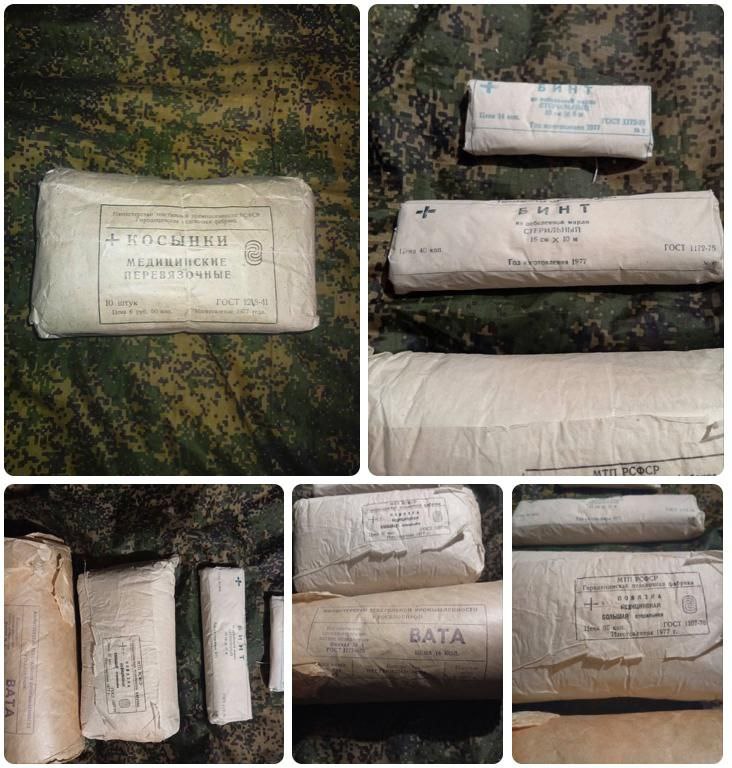 Российские войска, находящиеся на фронте в Украине начали получать бинты, вату и прочее 1977 года выпуска. Об этом сообщают местные паблики.