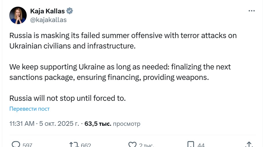 Россия своими масштабными ударами по мирным украинцам и инфраструктуре маскирует свое неудачное летнее наступление. Об этом написала глава европейской дипломатии Кая Каллас в своем аккаунте в Х.