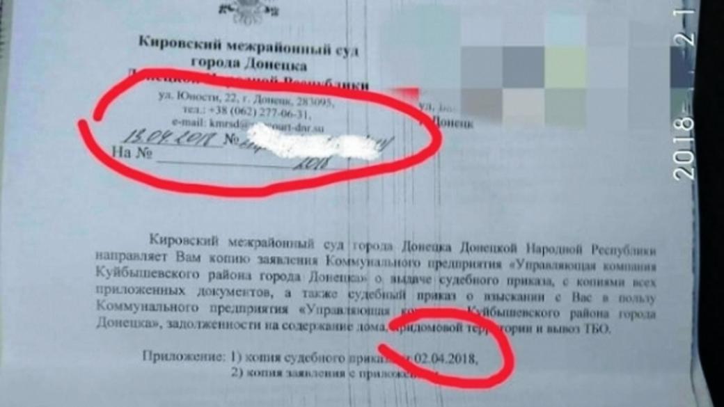 Жители неподконтрольного украинскому правительству Донецка в последнее время активно получают письма из так называемых «судов» о взыскании долгов за услуги ЖКХ в пользу коммунальных предприятий. Об этом дончане сообщают в социальных сетях.