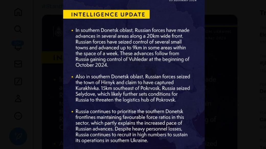 В британской разведке уточнили, что оккупанты в течение недели захватили контроль над несколькими небольшими населенными пунктами, и продвинулись до 9 км в некоторых районах. В ведомстве считают, что это является следствием захвата россиянами Угледара в начале октября 2024 года: