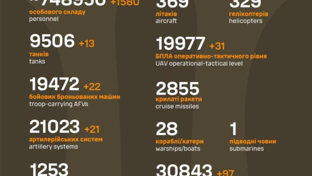 За прошедшие сутки защитники Украины ликвидировали 1580 оккупантов и уничтожили более 180 единиц техники.