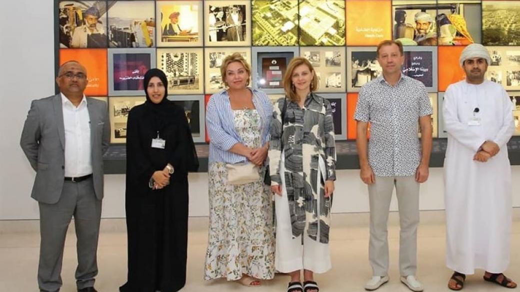 На фото, опубликованных пресс-службой Национального музея Омана супруга главы государства находится в окружении нескольких сотрудников музея и осматривает экспонаты.