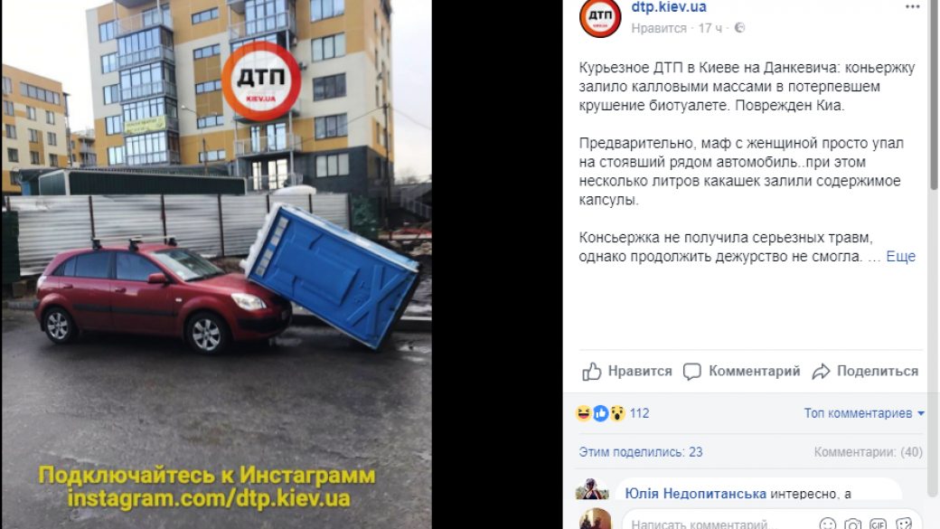 Вчера в Деснянском районе Киева произошло курьезное ДТП, в ходе которого биотуалет, в котором находилась женщина, упал на рядом стоящий автомобиль KIA.
