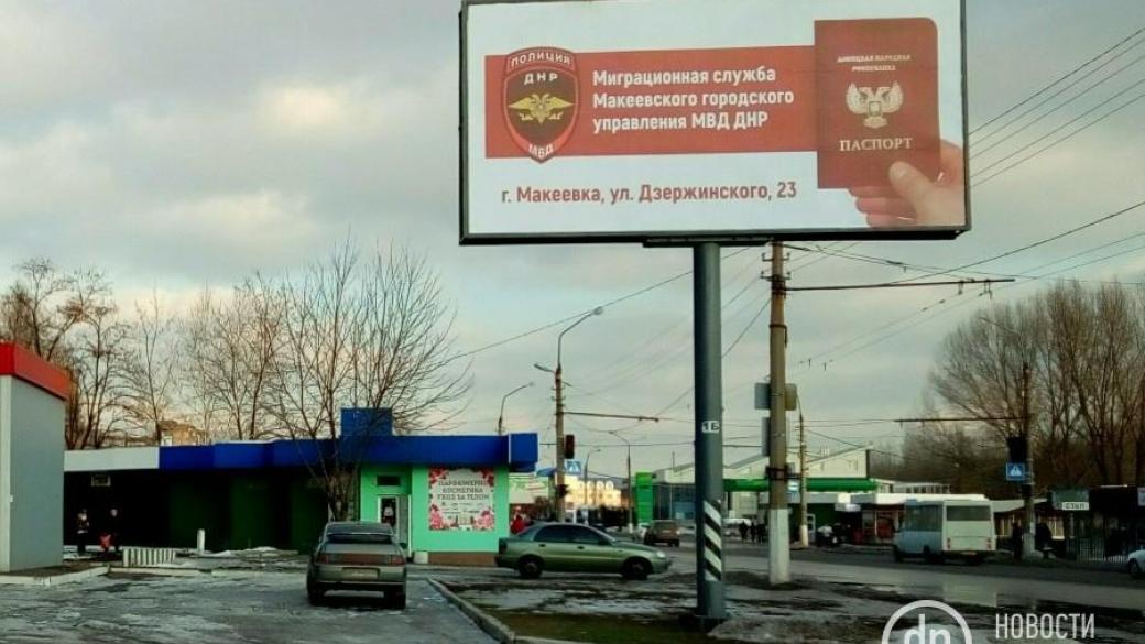 Так, на щите, расположенном вдоль проспекта Генерала Данилова помимо снимка паспорта указан адрес «миграционной службы Макеевского городского управления МВД ДНР».