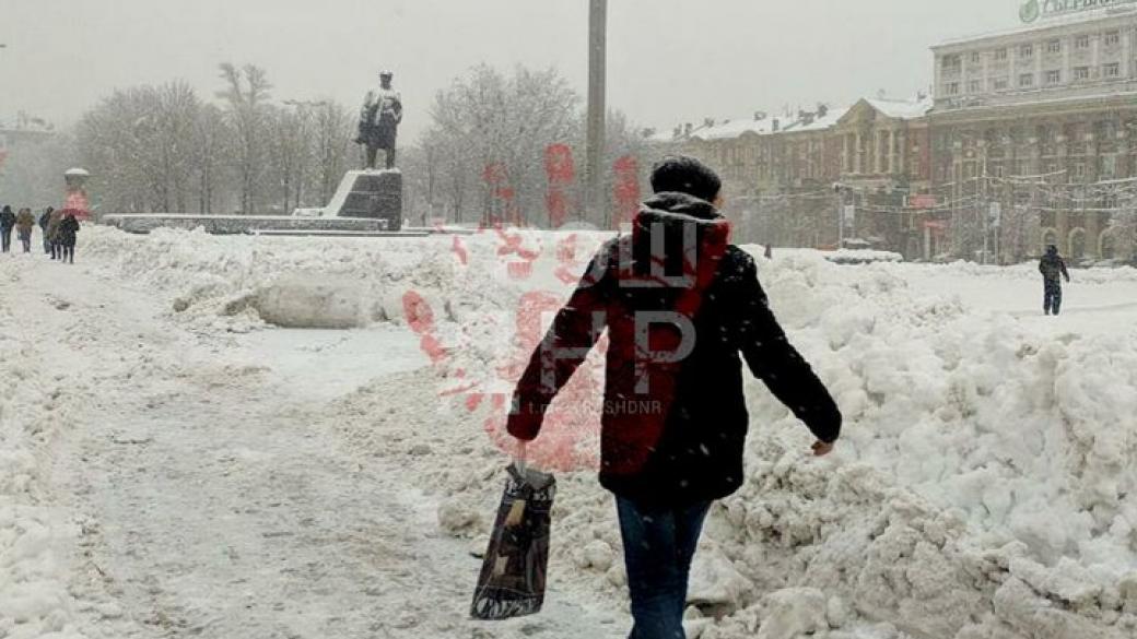 На снимке видно, что площадь полностью завалена снегом — буквально по колено взрослому человеку.