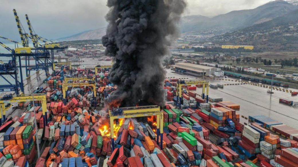 В порту Искендерун в Турции после землетрясения начался сильный пожар, пламя быстро распространяется среди сотен грузовых контейнеров.
