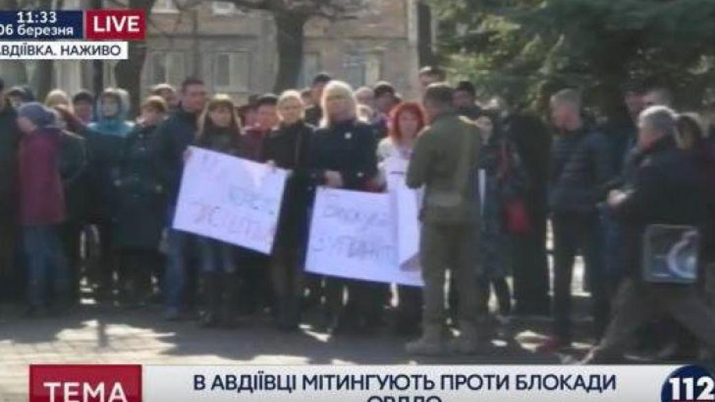 У участников митинга в руках плакаты, на которых в частности, написано «Блокировщики, остановитесь», «Блокада — нож в спину Авдеевки», «Мы хотим жить».