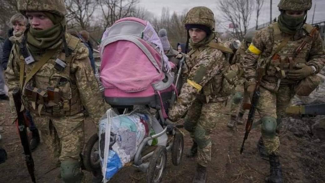 Украинские военные пытаются эвакуировать детей из Ирпеня, который подвергся массовым обстрелам.