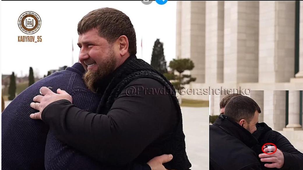Паблик опубликовал видео встречи главы Чечни с так называемым "главой ДНР" Денисом Пушилиным и отметил, что прибор отчетливо заметно во время объятий Кадырова с Пушилиным и он похож на переносной монитор для непрерывного контроля пульса и уровня кислорода в крови.