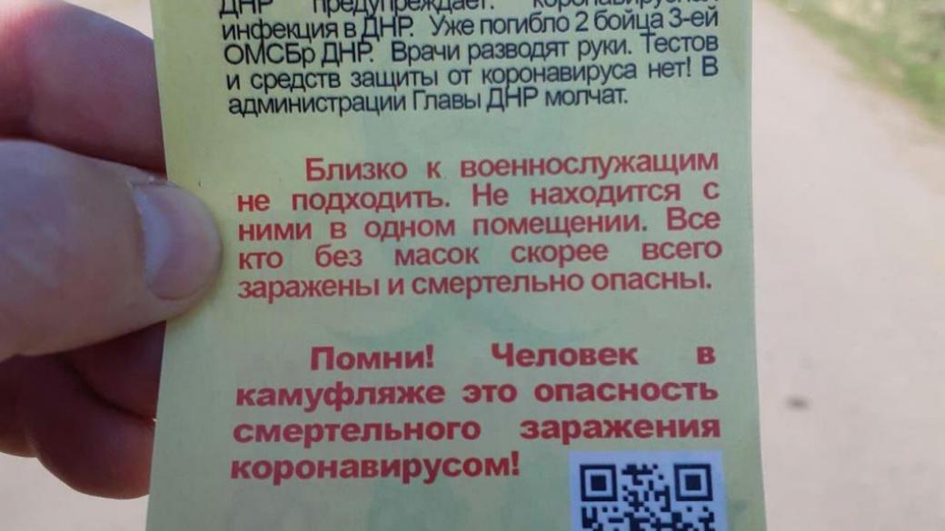 Как отмечает Штефан, члены «МГБ ДНР» при помощи курсантов и других членов НВФ активно собирают в листовках и проводят расследование, чтобы выявить тех, кто распространил «провокационные листовки».На фото видно, что в тексте открыток написано «Выбор Донбасса — Украина», а также имеются призывы к местным жителям держаться на расстоянии от членов НВФ, так как в рядах «ЛДНР» есть случаи заболевания коронавирусом.