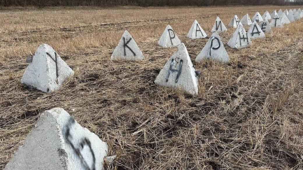 На линии обороны в Белгородской области за ночь каким-то "загадочным" образом на "зубах дракона" появились буквы, составив которые можно увидеть надпись "Украина, БНР ждет"