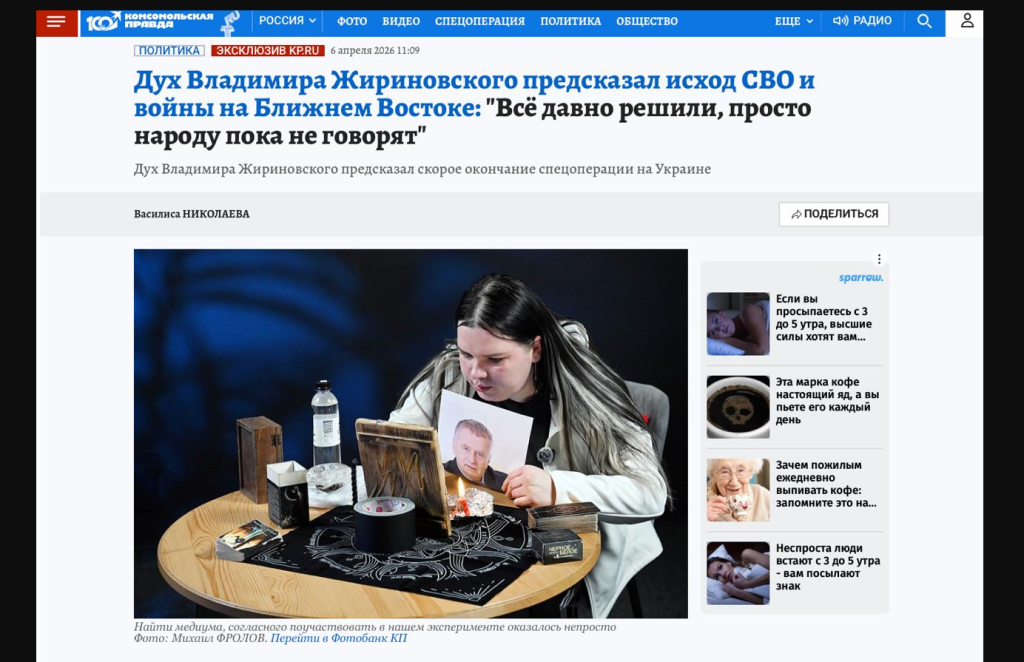 Одна из самых популярных газет рф — «Комсомольская правда» — опубликовала материал, в котором сообщила об «интервью» с духом покойного лидера ЛДПР Владимира Жириновского. Для проведения сеанса редакция пригласила двух экстрасенсов. Об этом пишут российские СМИ.