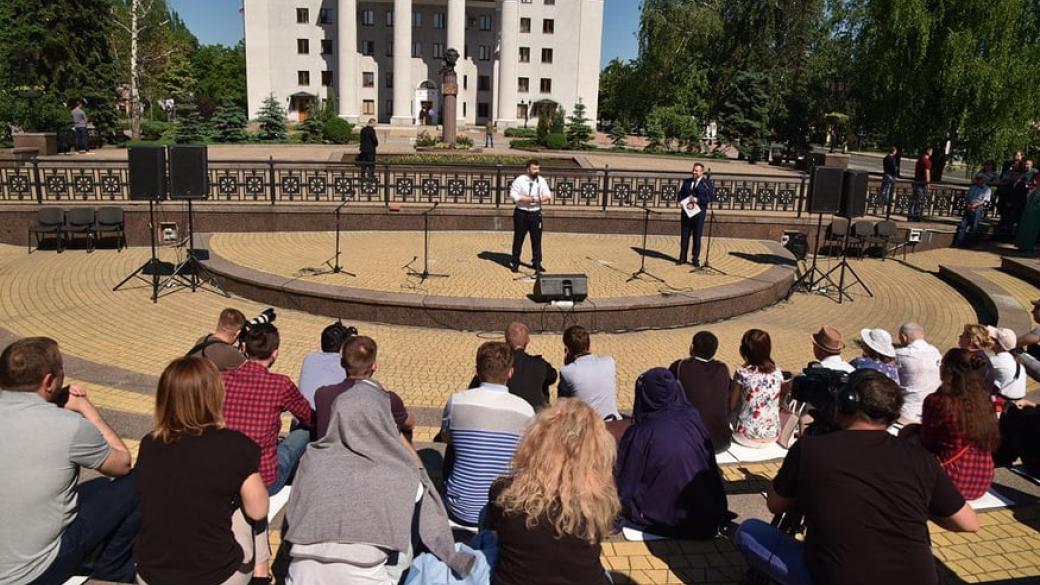 Так называемый «глава ДНР» Денис Пушилин зачитал стихи в центре временно неподконтрольного украинскому правительству Донецка.