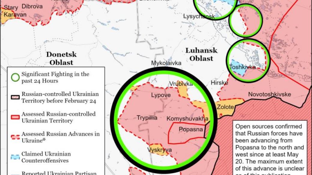 По словам аналитиков, несмотря на то, что российские силы продолжают сбрасывать технику и войска в район Северодонецка и Лисичанска, подразделения ВСУ за последние 48 часов провели успешную контратаку в Северодонецке и оттеснили российские войска к восточной окраине города. Также россиян оттеснили и из южных населенных пунктов.
