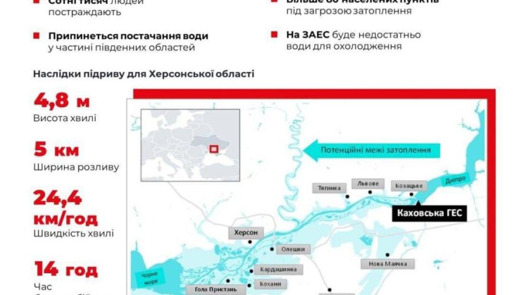 Опубликованы вероятные последствия подрыва оккупантами Каховской ГЭС в инфографике.