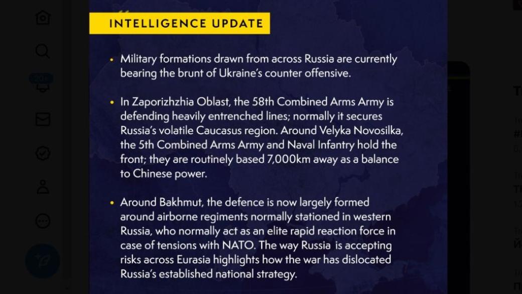 По данным британской разведки, 58-я общевойсковая армия РФ, обеспечивающая безопасность в Кавказском регионе, сейчас пытается оборонять позиции в Запорожской области. В то же время, в районе Великой Новоселки Донецкой области пытаются удерживать фронт 5-я общевойсковая армия и морская пехота, которые обычно базируются в 7000 км в качестве противовеса китайским силам.