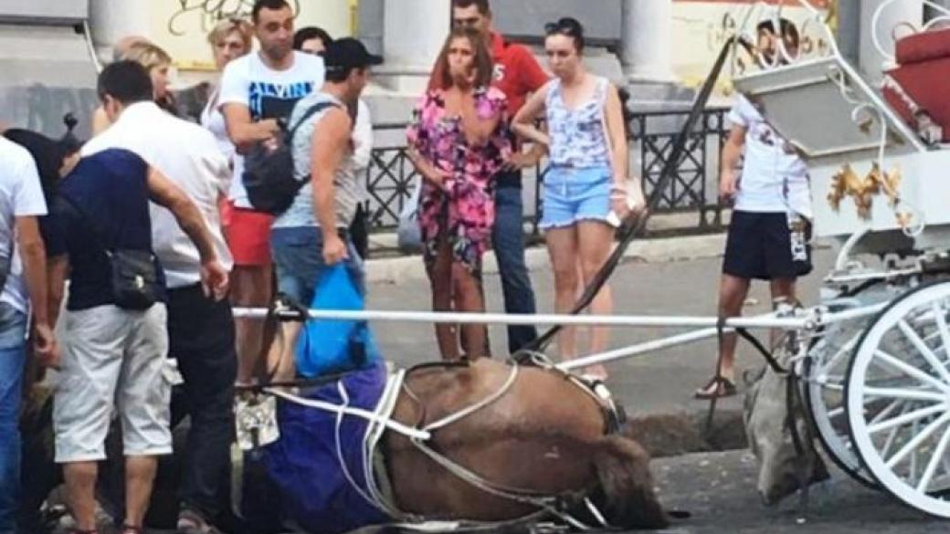 Вчера в центре Одессы от сильной жары в обморок упала лошадь, которую запрягали в прогулочную карету.