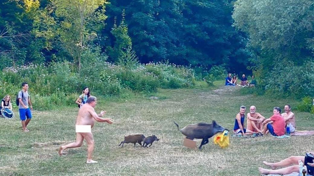Мужчине пришлось догонять трех кабанов без одежды, чтоб забрать свои вещи.