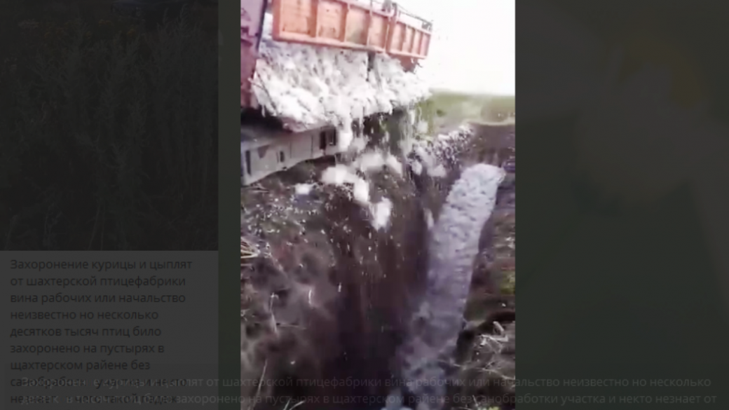 «Несколько десятков тысяч птиц было захоронено на пустырях в Шахтерском районе без санобработки участка и никто не знает от чего такой падеж. С рабочих удержали часть зарплаты за такой коллапс. И это не первая партия умирающих цыплят и бройлеров все дело в дешевых кормах и отношении к процессу».