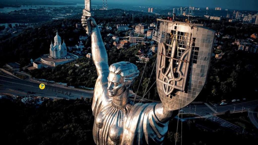 Украинский тризуб, наконец-то, сегодня утром установили на щите монумента «Родина Мать», сообщают СМИ