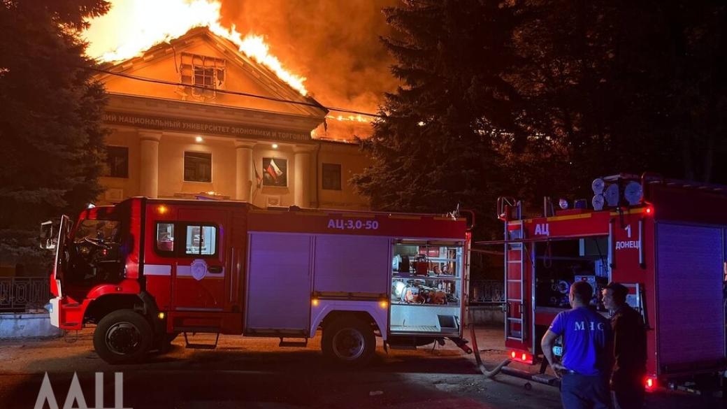Первый корпус Донецкого национального университета экономики и торговли имени Туган-Барановского, расположенный в Ворошиловском районе оккупированного Донецка, загорелся после обстрела города. Как сообщают пророссийские СМИ, огонь охватил весь верхний этаж.