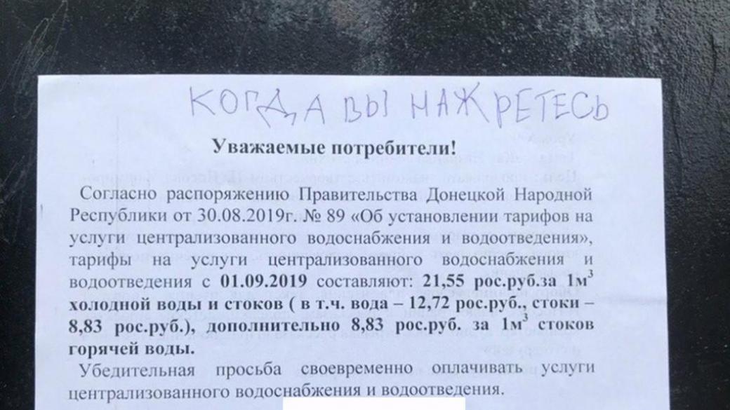 Так, житель неподконтрольного Украине Донецка сообщил, что ему принесли платежку за воду и стоки, согласно квитанции, тариф вырос в 2 раза: