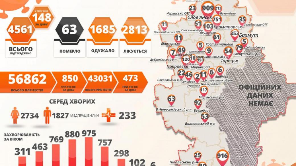 За все время пандемии на подконтрольной Украине части Донетчины коронавирус подтвержден у 4 561 человека. Из них 1 685 пациентов выздоровели, а 63 человека умерли. Продолжают лечение 2 813 пациентов, говорится в сообщении
