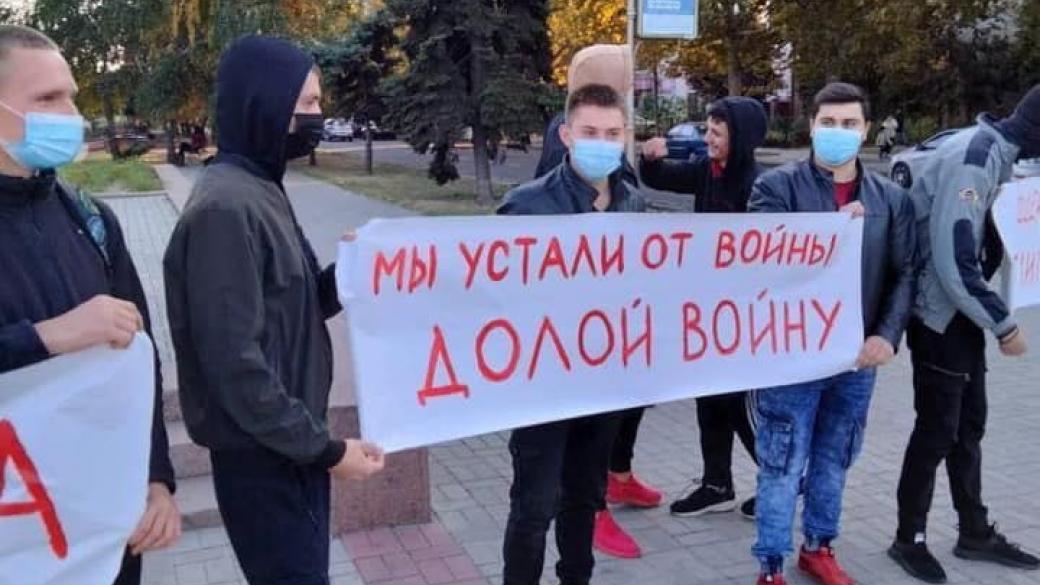 Прикрывая лица масками, они развернули в центре города банеры с надписями: «Украина — не Америка», «Долой войну», «Мы устали от войны».