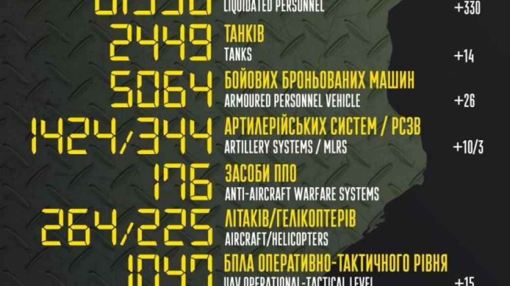 По данным Генштаба, общие боевые потери противника с 24.02 по состоянию на 06.10 ориентировочно составили: