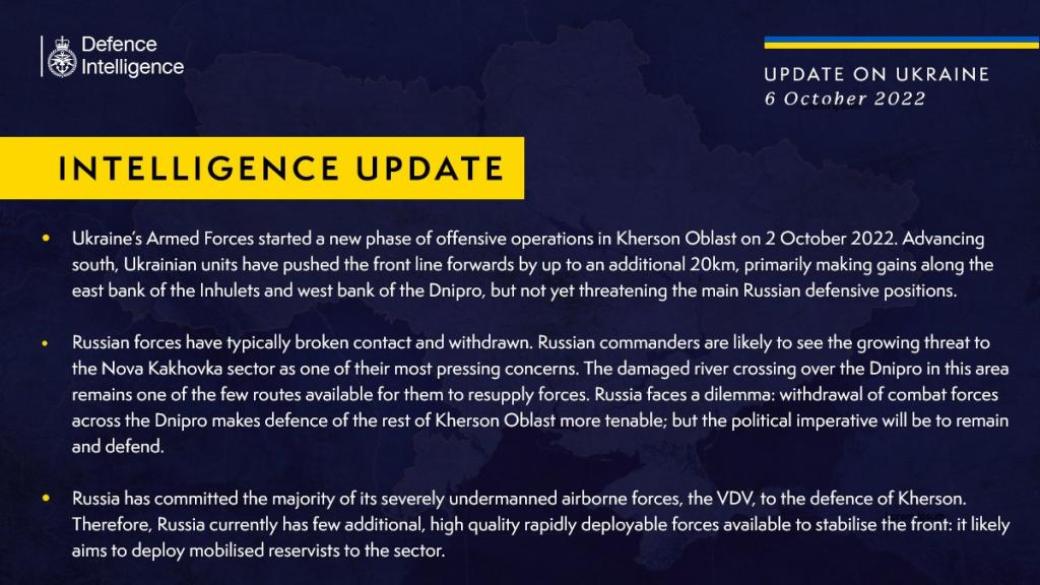При этом Россия направила большую часть недоукомплектованных воздушно-десантных сил, ВДВ, на оборону захваченного РФ Херсона. Отмечается, что России в настоящее время мало дополнительных, качественных сил быстрого развертывания, доступных для стабилизации фронта и она нацелена на переброску мобилизованных резервов на этот сектор.