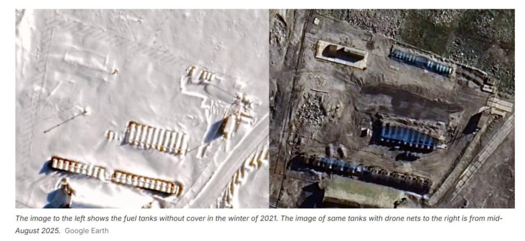 Спутниковые снимки, обновленные Google Earth в августе, показывают, что на территории поселка Северный три ряда топливных баков покрыты голубоватыми металлическими конструкциями. Эти сетки предназначены для того, чтобы не допустить возгорания топлива при ударе БПЛА. Баки, расположенные ближе к порту, содержат бензин для машин, используемых на ядерном объекте. В центре поселка находятся более крупные резервуары с мазутом, обеспечивающие тепло и электричество, они пока остаются без защиты. Не укрыты также несколько емкостей с авиационным топливом у вертолетной площадки.