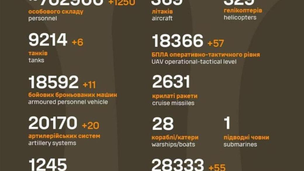 За минувшие сутки Силы обороны Украины ликвидировали 1 250 российских захватчиков и уничтожили более 150 единиц техники врага.