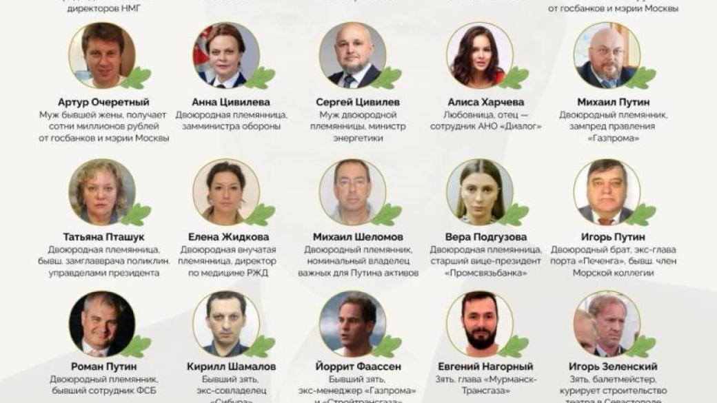 «Проект» выяснил, что самой влиятельной в рф является ветвь двоюродного брата президента Евгения Путина: его дети — Михаил Путин (зампред правления «Газпрома») и Анна Цивилева (замминистра обороны, супруга министра энергетики Сергея Цивилева), которые занимают ключевые посты в правительстве и госкорпорациях.