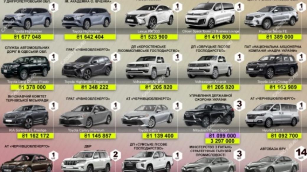 Отмечается, что в Государственное бюро расследований закупили два Land Cruiser 150 Prado за 2,1 млн гривен. Toyota Land Cruiser через государственные закупки приобрели и «Надра Украины». Стоимость иномарки — 1,2 млн гривен.