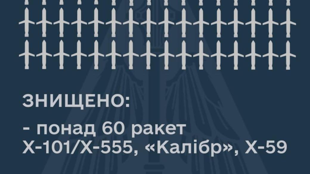 По данным издания, россияне нанесли удары по Украине следующими видами ракет: 38 Х-101/Х-555, 22 “Калибра”, три Х-22, шесть Х-59 и одна Х-31П.