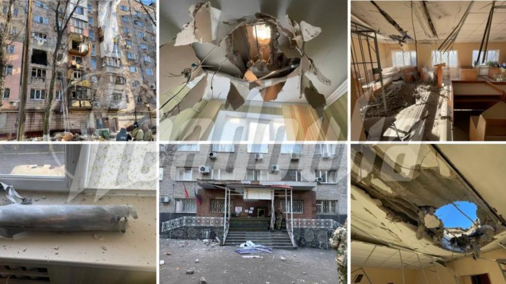 Опубликованы кадры последствий обстрела здания "прокуратуры" в Ворошиловском районе, где также находится "суд" — потолок на 4-м этаже оказался пробит насквозь, фасад также получил значительные повреждения. Пропагандисты утверждают, что обошлось без пострадавших.