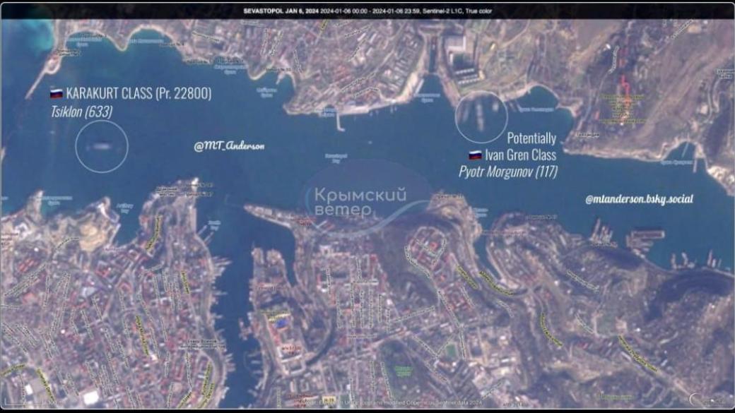 На снимке со спутника Sentinel 2 за 6 января у пирса в Севастопольской бухте отмечен, по всей вероятности, большой десантный корабль (БДК) проекта 11711 типа "Иван Грен".