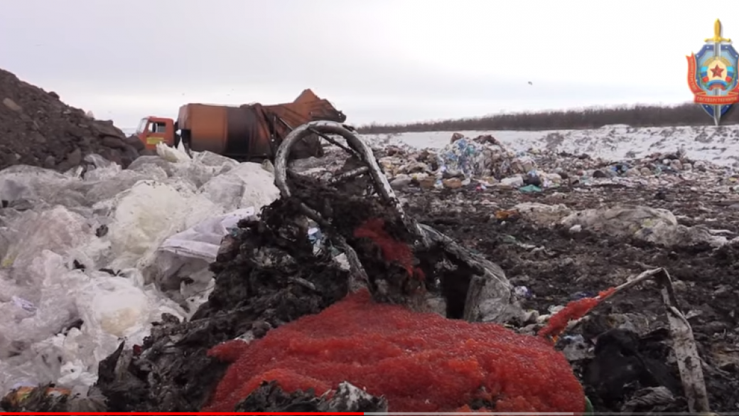 Боевики ОРЛО показательно раздавили бульдозером 85 килограммов контрафактной красной икры, которую они назвали «недоброкачественной».
