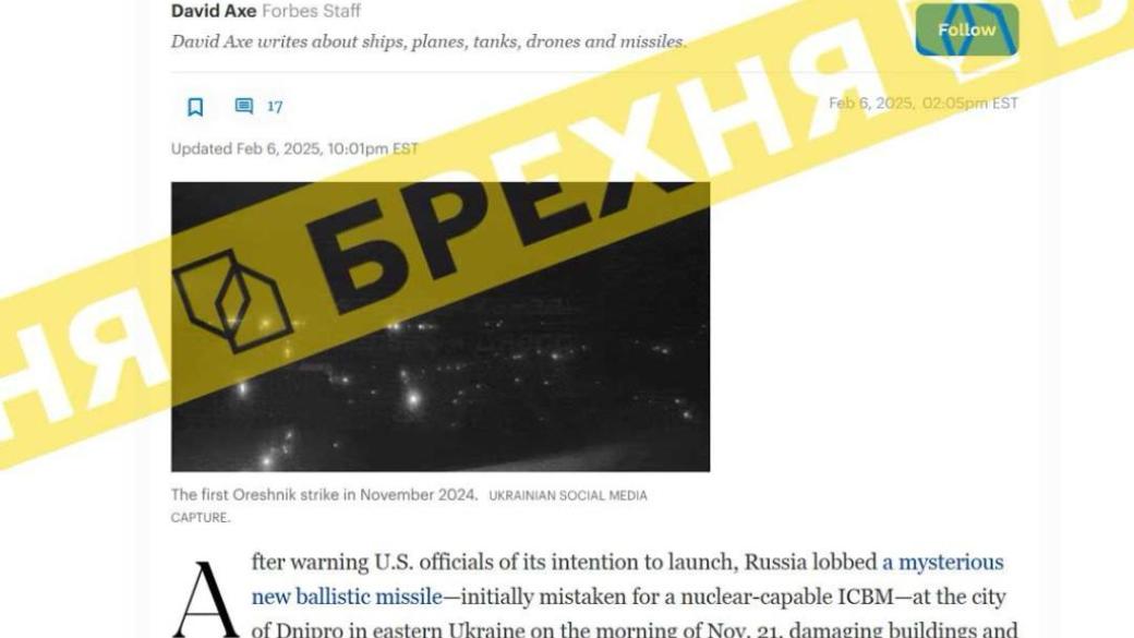 Информация Forbes о том, что рф якобы могла запустить "Орешник" по Киеву 6 февраля, не является правдивой. Об этом сообщает ЦПД в Telegram-канале.