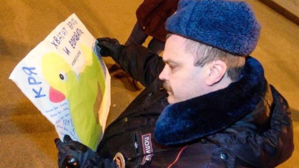Сообщается, что активисты в количестве 40 человек водили хороводы вокруг полицейских машин и крякали стишок «Кря-кря, против этого царя». После чего, шестеро из них были задержаны правоохранителями.
