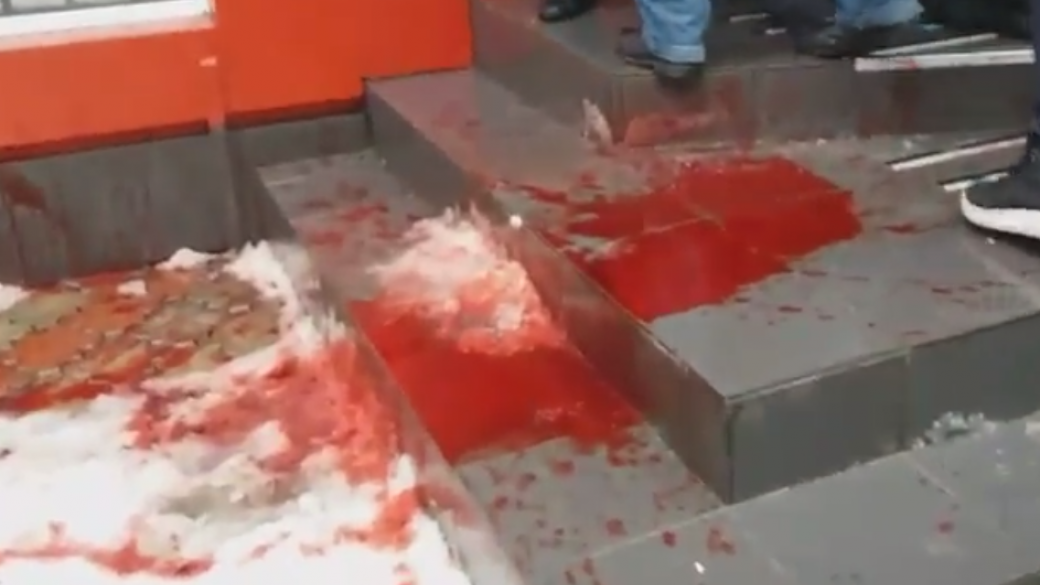 СМИ сообщают: «В Виннице активисты возмущены тем, что депутаты не явились на внеочередную сессию облсовета, и облили красной краской лестницы в местный офис партии «БПП».