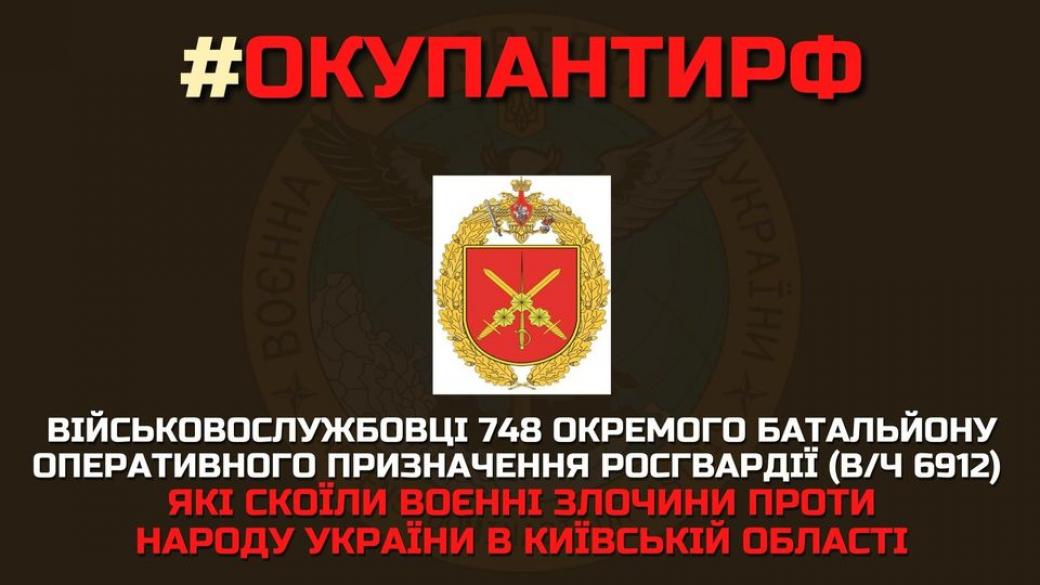 В разведведомстве отметили, что ГУР МО Украины получило список военнослужащих 748 отдельного батальона оперативного назначения Росгвардии (в/ч 6912) г. Хабаровск, совершающих военные преступления против народа Украины в Киевской области. Также в разведке добавили, что все военные преступники РФ за совершенные преступления против мирного населения Украины предстанут перед судом и будут привлечены к ответственности.