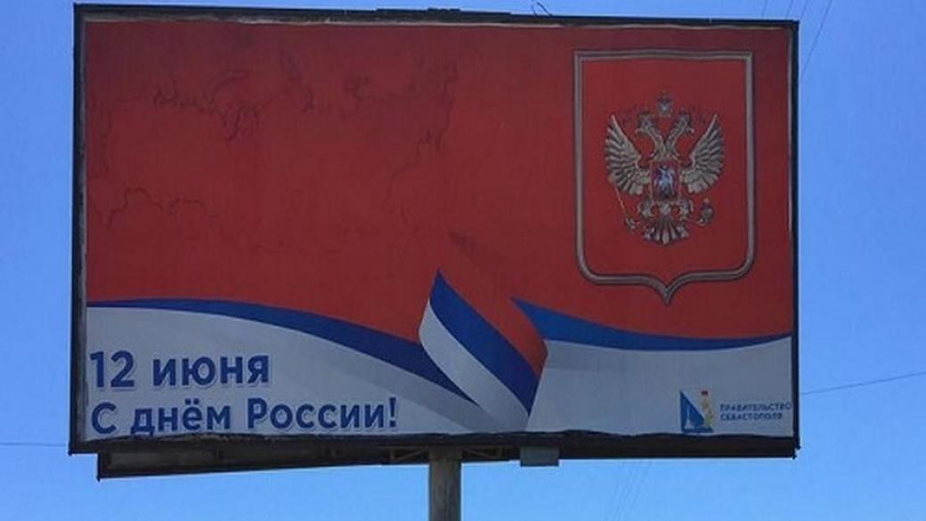 В оккупированном Севастополе ко Дню России, который в РФ отмечают 12 июня, оккупационная «власть» разместила 30 билбордов, на которых изображен перевернутый флаг РФ. Также, на некоторых билбордах изображена карта России без Крыма.
