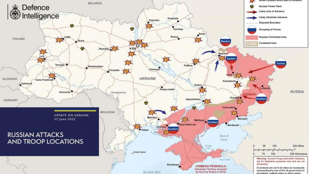 За минувшие сутки ситуация на фронтах в Украине особо не изменилась. На данный момент российские войска сосредоточили свое наступление на Донбассе. Об этом сообщает Министерство обороны Великобритании в опубликованной карте боевых действий по состоянию на 7 мая.