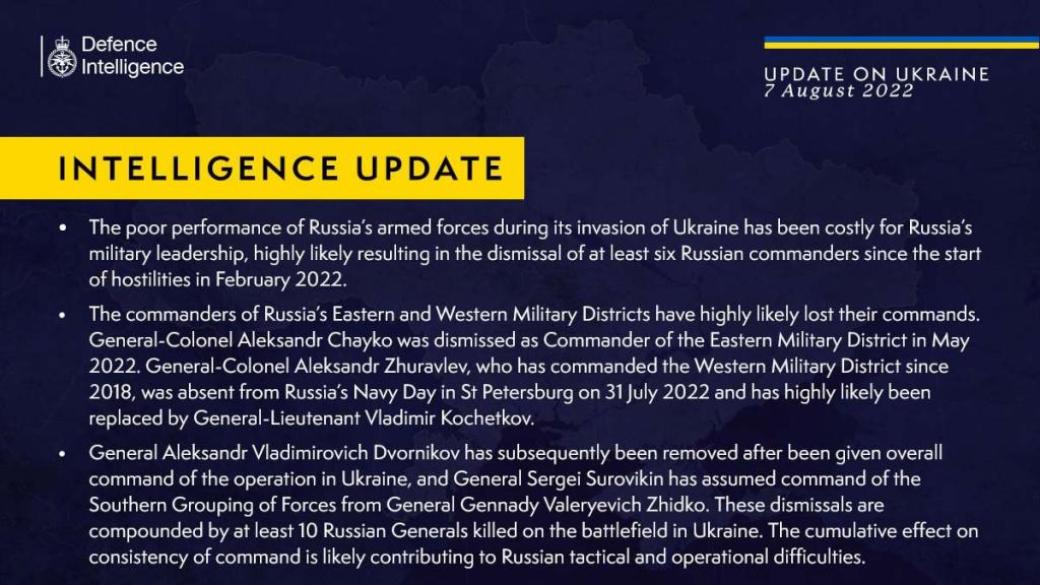 «Эти увольнения усугубляются тем, что на поле боя в Украине погибли по меньшей мере 10 российских генералов. Совокупное влияние на согласованность командования, вероятно, усугубляет тактические и оперативные проблемы России», - отмечают эксперты в британской разведке.