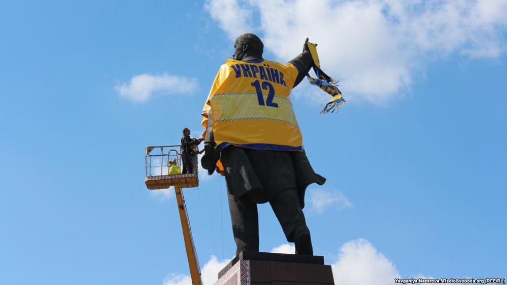 Болельщики решили таким образом поддержать украинскую сборную в отборочных играх Евро-2016. В руке Ленина активисты закрепили фанатскую «розу» — шарфик с символикой.