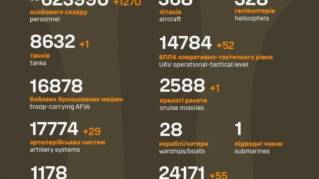 В ходе боев в течение минувших суток ВСУ уничтожили 1270 оккупантов и десятки единиц вражеской техники.