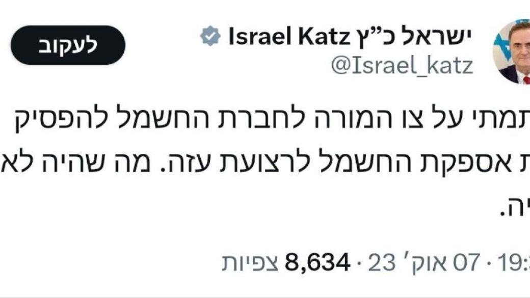Министр энергетики Израиля Исраэль Кац приказал полностью остановить подачу электроэнергии в сектор Газа.