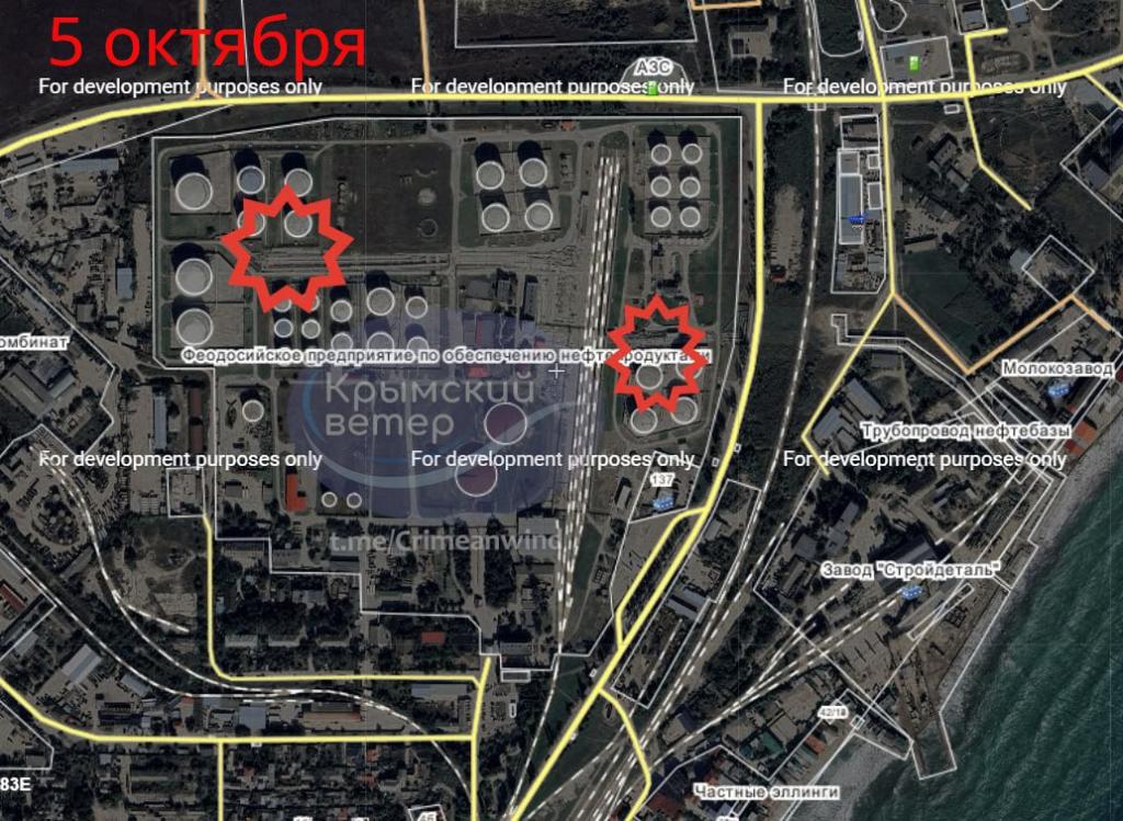В ночь с 5 на 6 октября БПЛА атаковали нефтебазу в оккупированной Феодосии (Крым). По состоянию на 7 октября огонь на нефтебазе в Феодосии перекинулся на другие резервуары, сообщает мониторинговая группа "Крымского ветра" со ссылкой на данные спутниковой съемки.