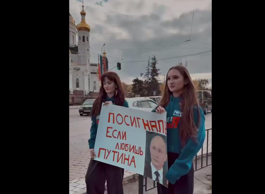 Ресурсы публикуют видео, на котором две местные жительницы стоят на одной из центральных улиц города с плакатом «посигналь, если любишь Путина» и слышно, как проезжающие мимо автомобили сигналят.